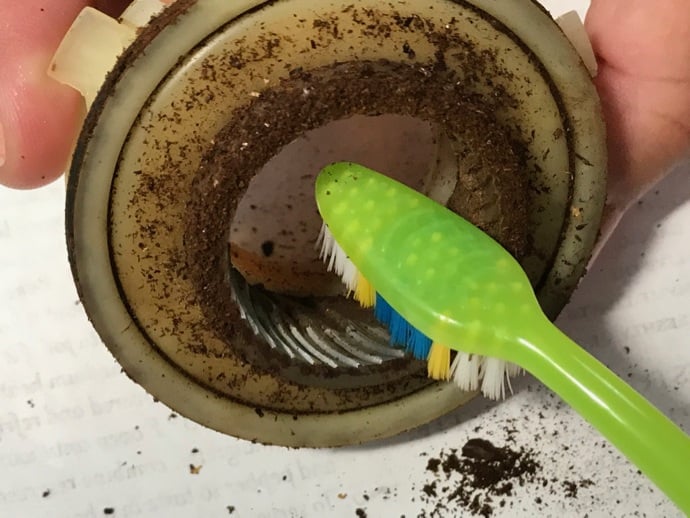 现在使用你的柔软刷子擦掉所有咖啡渣和灰尘,这些咖啡和灰尘紧贴着磨床内部。这是那些木制牙签和棉质拭子可能派上用场的地方:你想确保你的古老的研磨(以及用它们一起去的油),在你的毛刺和其他内表面上。